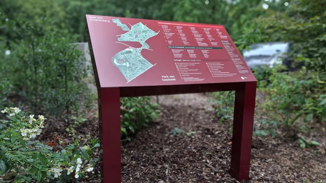 导视牌采用高挑纤细的立柱造型,垂直形态与森林树木的纵向线条形成呼应,在不破坏自然景观整体性的同时,实现了远距离引导。镜面材质的运用巧妙反射周围绿植,让导视牌在不同光线和季节中呈现动态变化,进一步消弭了人工造物与自然的边界。